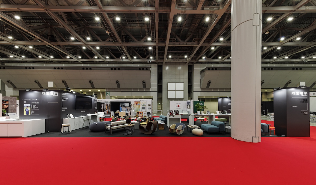 商店建築社と繋がりのあるメーカー等に声をかけて、デザイナーズチェアを提供してもらいエリアを埋め尽くすように配置。来場者が自由に座って休めるようにしました。