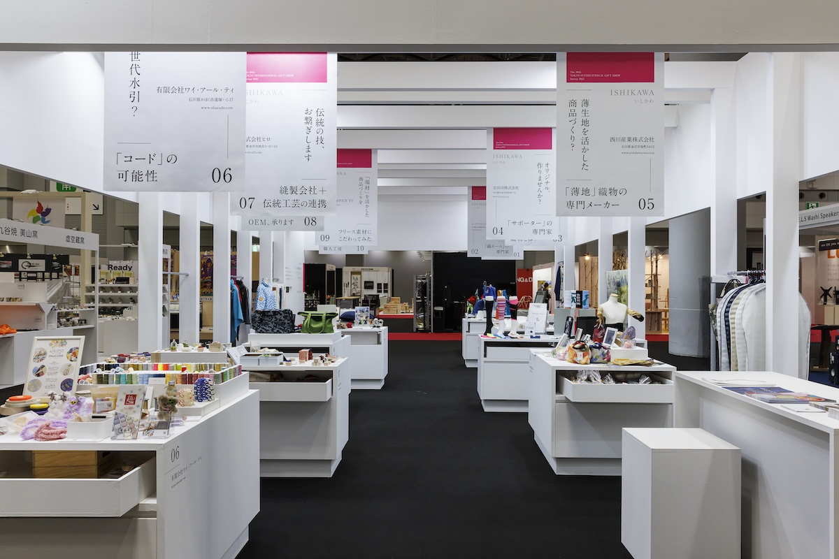 ギフト・ショーは東京ビッグサイトの東棟1〜6ホール、南棟1〜4ホールで開催される大規模展示会。今回は2700社を超える出展があり、とてもにぎわいます。石川県繊維協会は床にカーペットが敷かれて落ち着いた雰囲気がある南棟に出展でした。