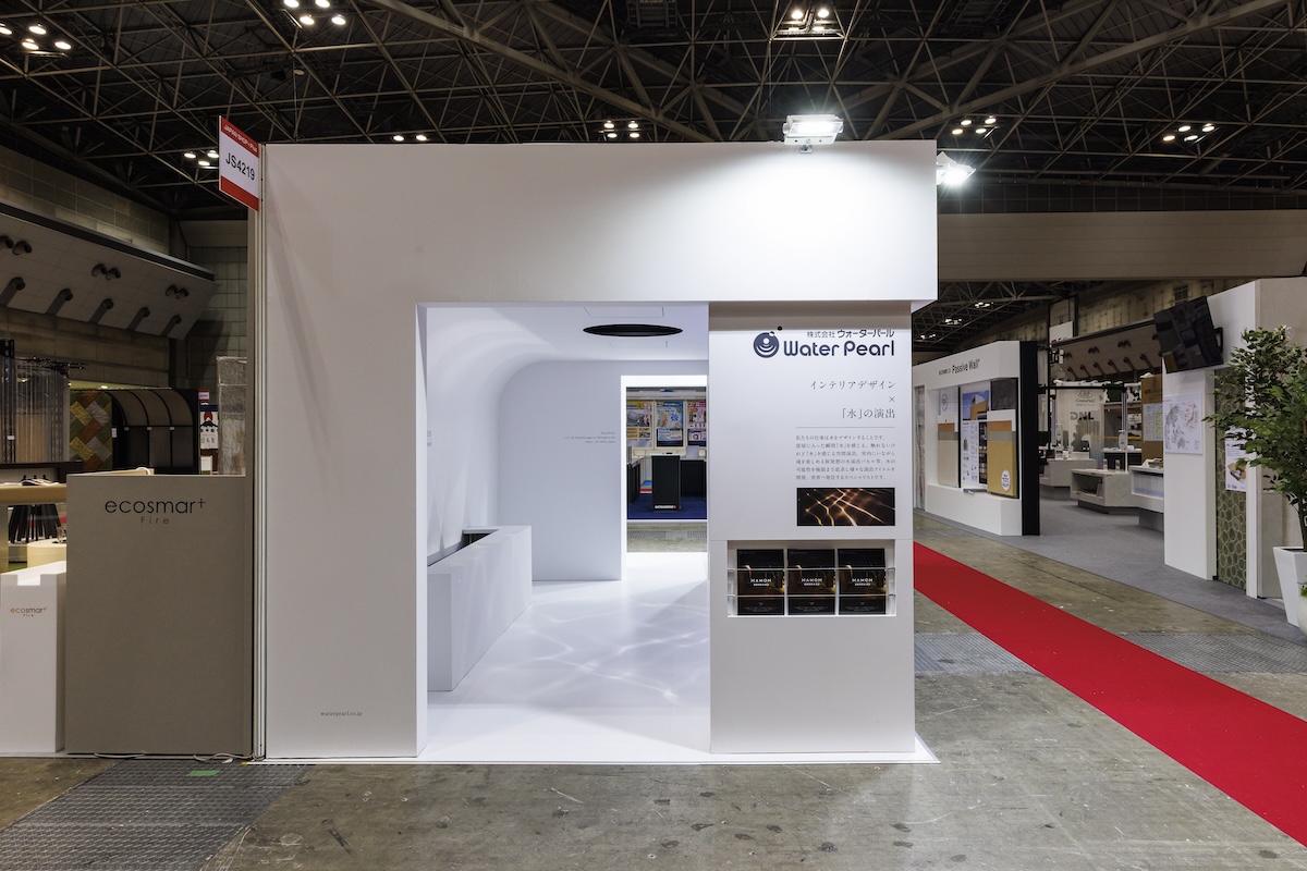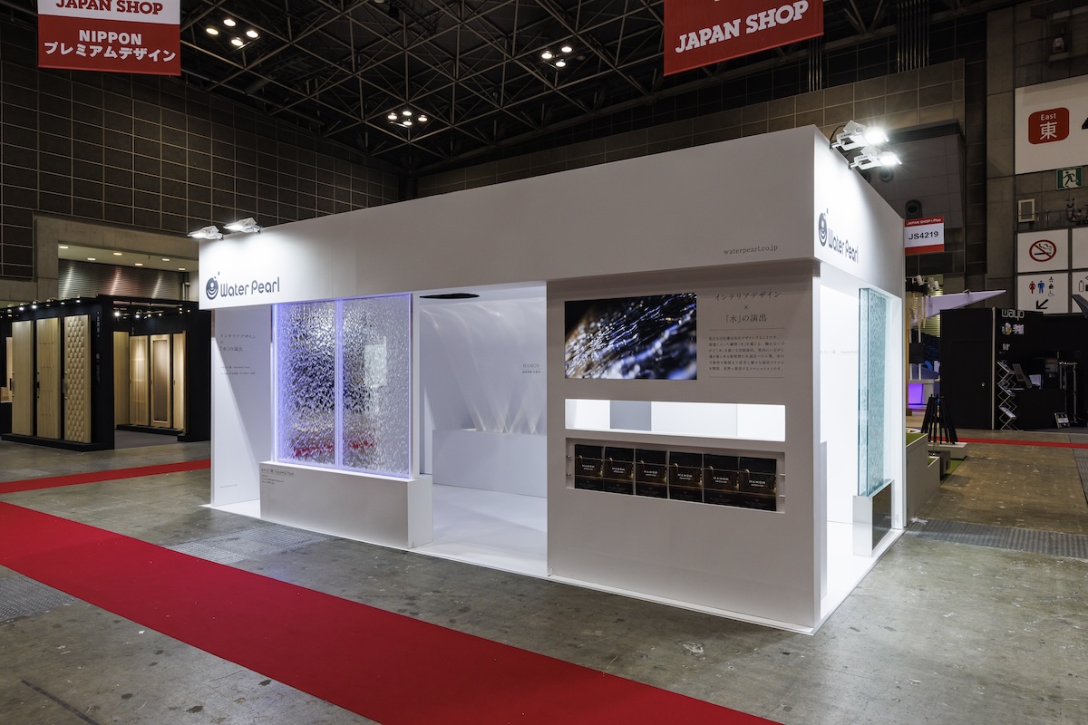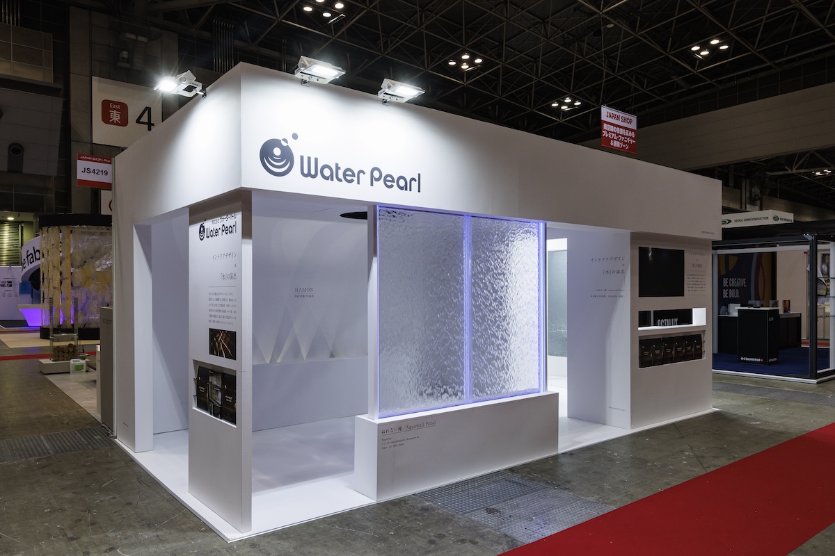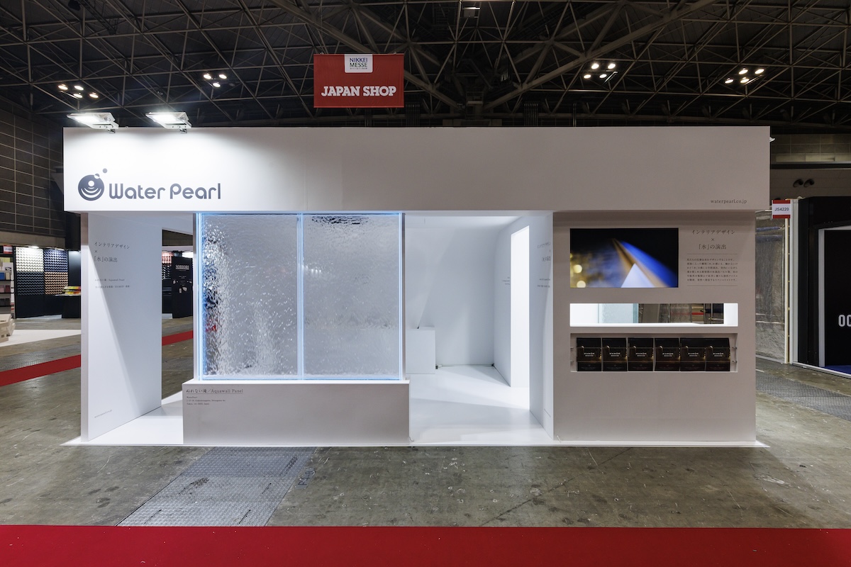 ブースは2小間3面開放、メイン通路沿いで、会場の入口方面向いた好立地。水が流れるアクリルガラス「アクアウォールパネル」など、水と光をテーマにした演出を体験できるブースとしました。