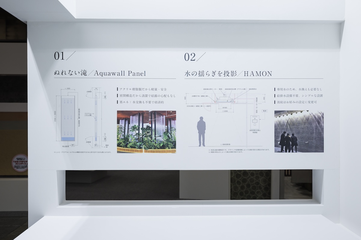 波紋を投影して水を感じられる商品「HAMON」は、天井の円形部分に水槽を載せるため、重量を支えるしっかりとした柱も必要でした。柱を兼ねた壁面にも企業紹介文とパンフレットを設置しています。