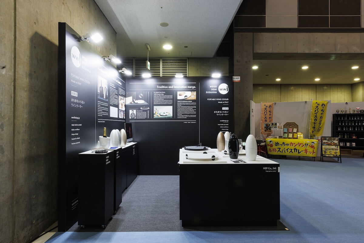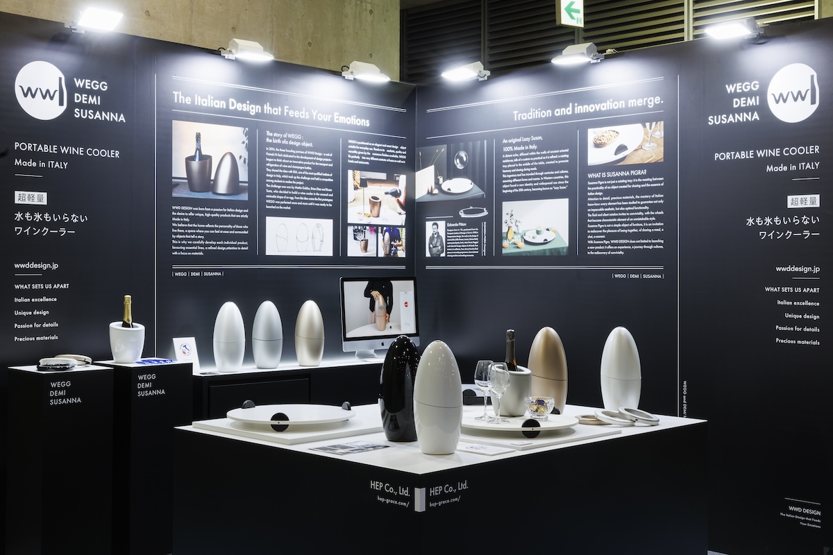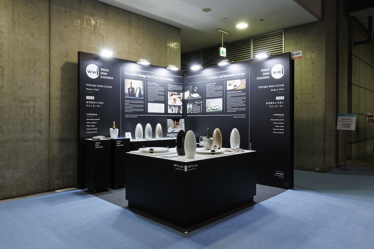 埼玉県川口市に本社を置く株式会社HEPは、卵の形をしたイタリア製ワインクーラー「WEGG(ウェッグ)」の総輸入販売元です。スーパーペンギンとの繋がりは、同社社長が川口市の商工会セミナーにてスーパーペンギン代表・竹村のスピーチを聞いたことに始まりました。ギフト・ショー春2024での初出展時にスーパーペンギンがブースデザインを担当。今回は2回目のご依頼でした。