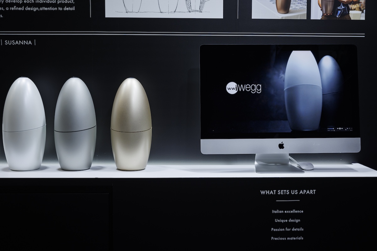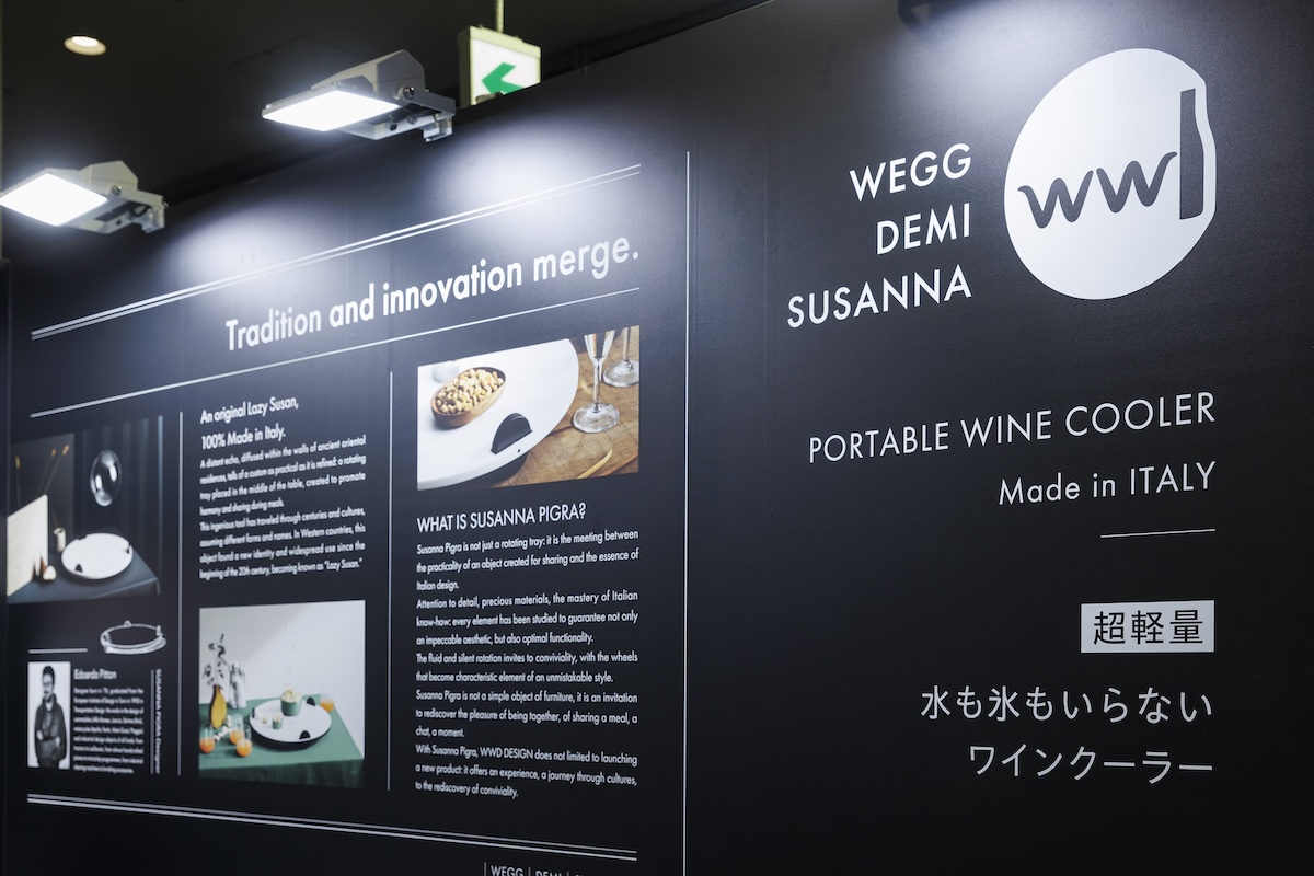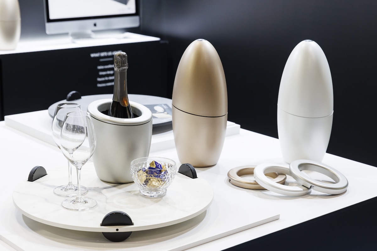 今回展示した商品はワインクーラー2種(「WEGG」と「DEMI」)と、初お披露目の「SUSANNA」という車輪が3つ付いた大皿の計3種。いずれもイタリアらしい遊び心に溢れたオシャレな商品です。主力商品のワインクーラーについて、本国イタリアではブルーやピンクなどの鮮やかな色も人気ですが、日本市場の嗜好に合わせ、今回は白・黒・シルバー・ゴールド系の落ち着いた色味のみで展示構成しました。カラーサンプルは商談時に必要に応じて提示します。