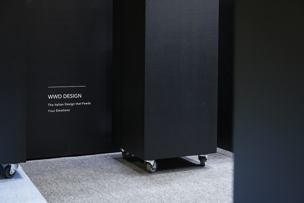 今回は「海外の雑誌風」をテーマに壁面グラフィックをデザインしました。壁面全体を黒一色にすることで、商品の持つフォルムの美しさや高級感がより一層引き立ち、シックな雰囲気が漂います。ただし、小間位置の寂しさを補うために、グラフィックはかなり描き込みました。現地デザイナーのポートレートやイメージ写真、ラフスケッチを散りばめ、文字情報は英語表記を採用。敢えて日本語を使わないことで、外国製であることを直感的に伝えました。
