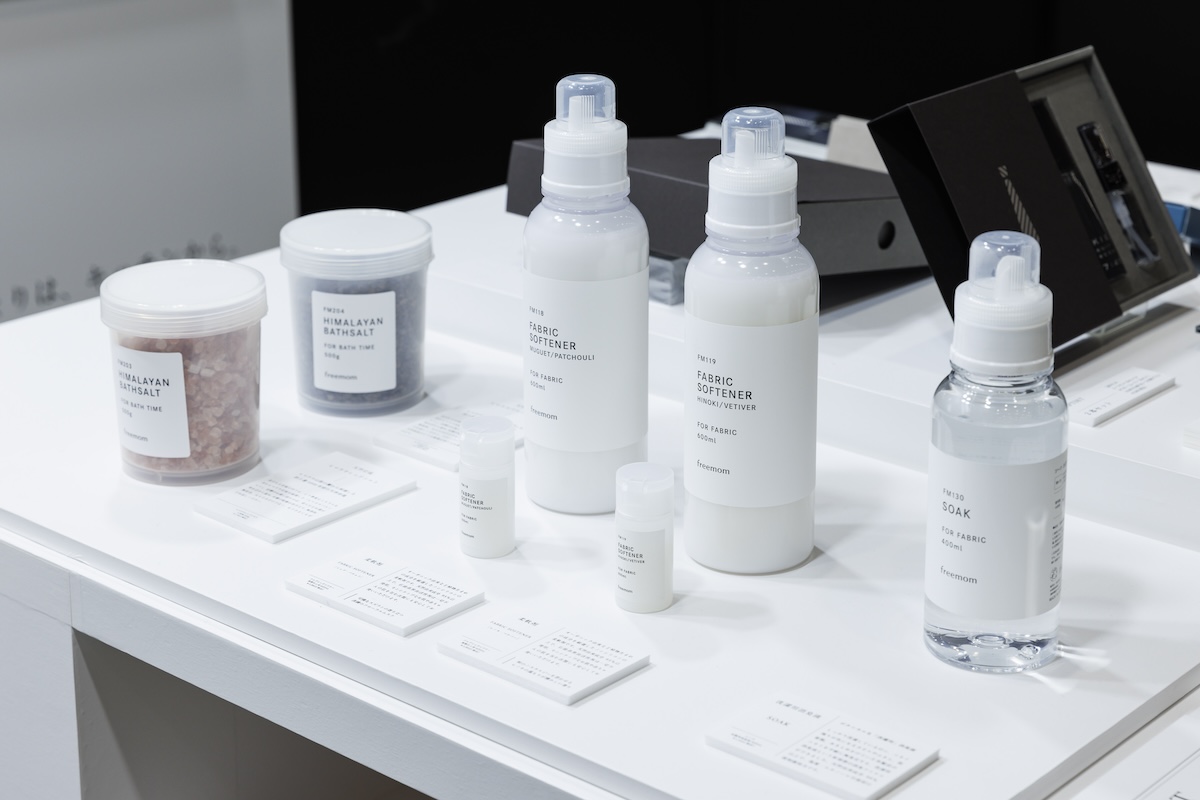 展示台上には、左からバスソルト、柔軟剤と肌にやさしいこだわりの商品が並びます。